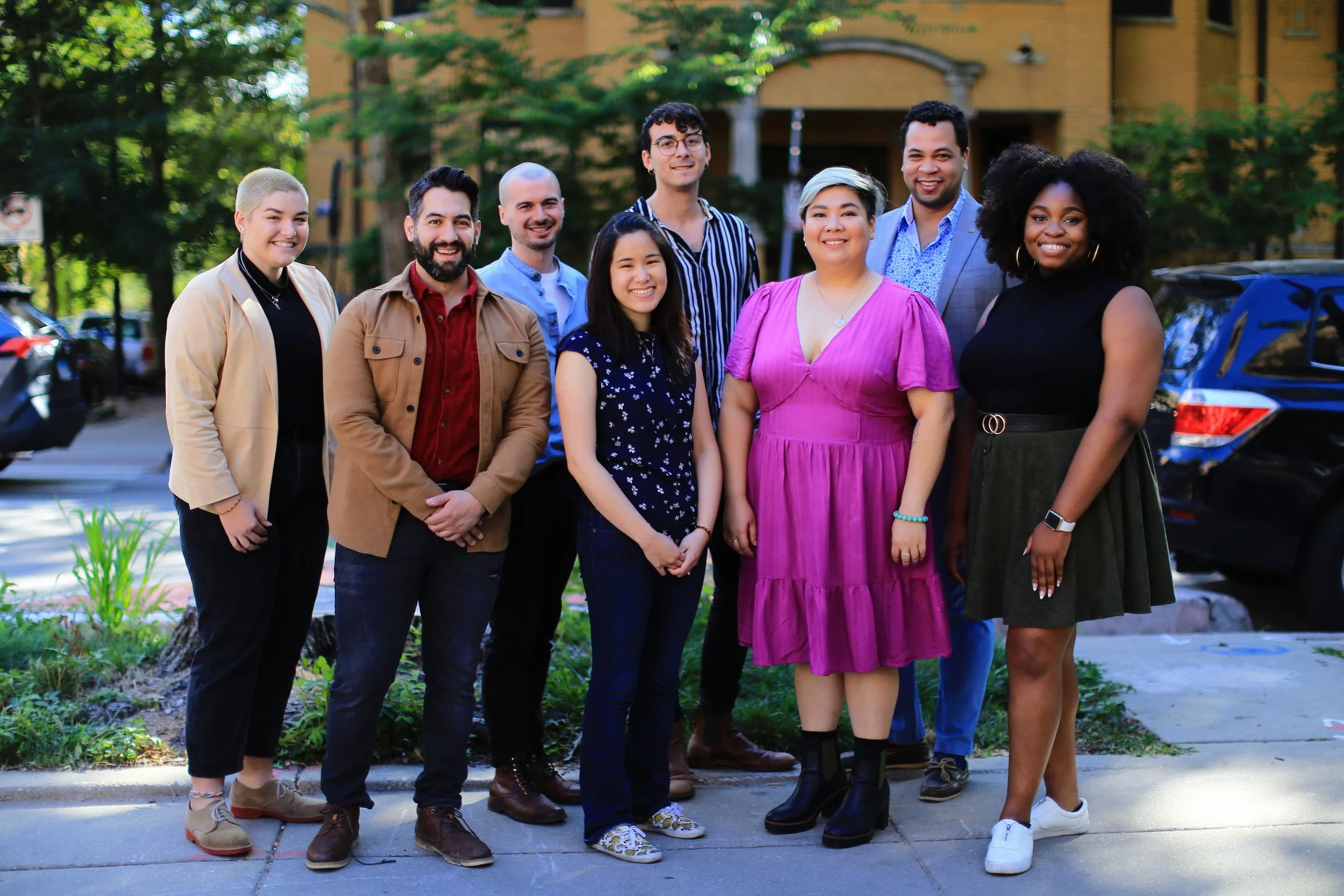 LYNX 2022-23 composers and performing artists pose for a picture on a beautiful Chicago day. From left: Corinne Klein, Matthew Recio, Shane Scott Cook, Florence Mak, Paul Novak, Pauline Tan, Samuel James Dewese, Veena Akama-Makia (not pictured, Eugenia Cheng)